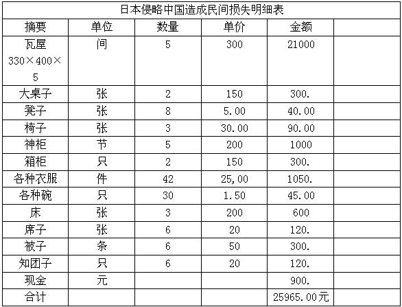 细节:我家原住在江苏省盐城市,1936年日军轰炸盐城市我家所有财产毁于一旦,现列出清单,日本政府必须赔偿给我家。备注:信封丢失