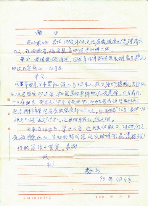 四五年四月,日本军队侵入高坪,杀人放火,强奸,掳[掠]。大部队在住房西后,沙柒岩,和国军为争阵地,几次周拆。日军有几个到脚,把表兄,胞兄杀死在地,把姑母,表姐活活奸死。然后,用炸弹把房屋墙壁全部炸烂。当年姑母“36岁”,表姐“17岁”,胞兄“16岁”表兄“15岁”。这事[件]多伤心,但无法。