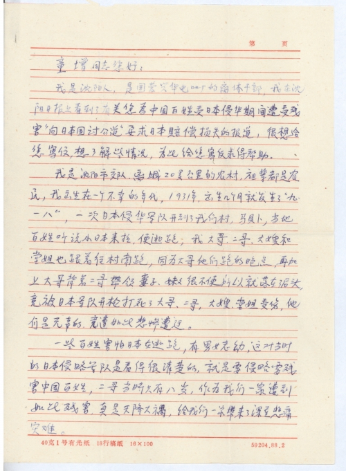 我是沈阳人,是国营兴华电器厂的离休干部,我在沈阳日报上看到了有关您为中国百姓受日本侵华期间遭受残害“向日本国讨公道”要求日本赔偿损失的报道,很想给您写信,想了解些情况,为此给您写信求得帮助。