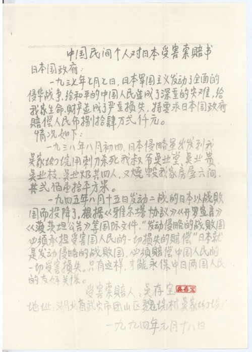 中国民间个人对日本受害索赔书