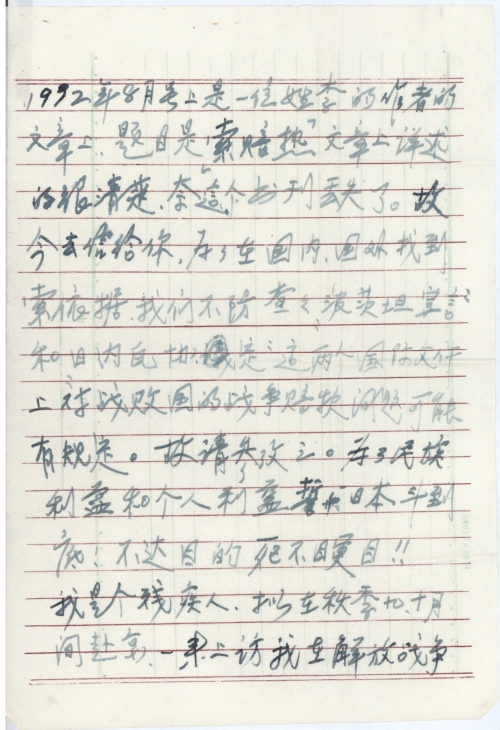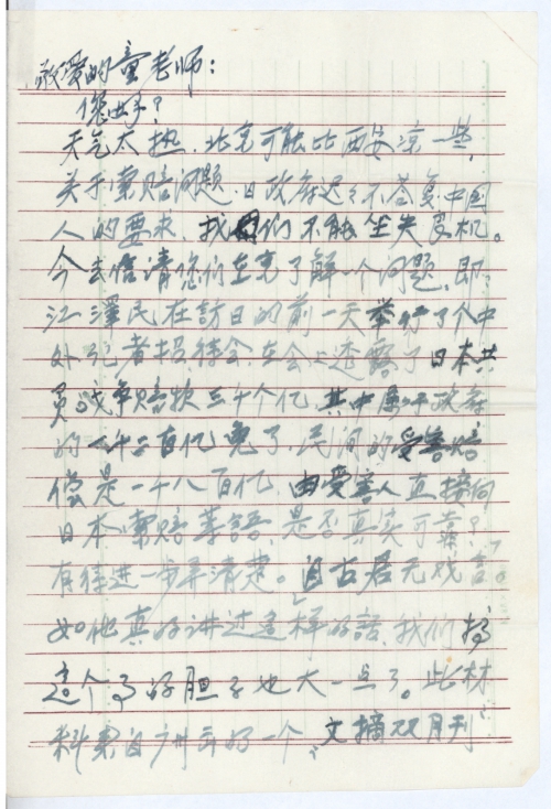 天气太热,北京可能比西安凉一些,关于索赔问题,日政府迟迟不答复,中国人的要求,我们不能坐失良机。今去信请您们在京了解一个问题,即江泽民在访日的前一天举行了个中外记者招待会,在会上透露了日本共负战争赔款三千个亿,其中属于政府的一千二百亿免了,民间的受害赔偿是一千八百亿,由受害人之间向日本索赔等语,是否真实可靠?有待进一步弄清楚。自古君无戏言。如他真的讲过这样的话,我们搞这个事的胆子也大一点了。此材料来自广州出的一个“文摘双月刊”1992年8月号上是一位姓李的作者的文章上,题目是“索赔热”。文章上祥述的很清楚,奈这个书刊丢失了。故今去信给你,为了在国内,国外找到索依据,我们不防查查《波茨坦宣言》和《日内瓦协定》这两个国际文件上对战败国的战争赔款问题可能有规定。故请参考之。为了民族利益和个人利益誓与日本斗到底!不达目的死不瞑目!!