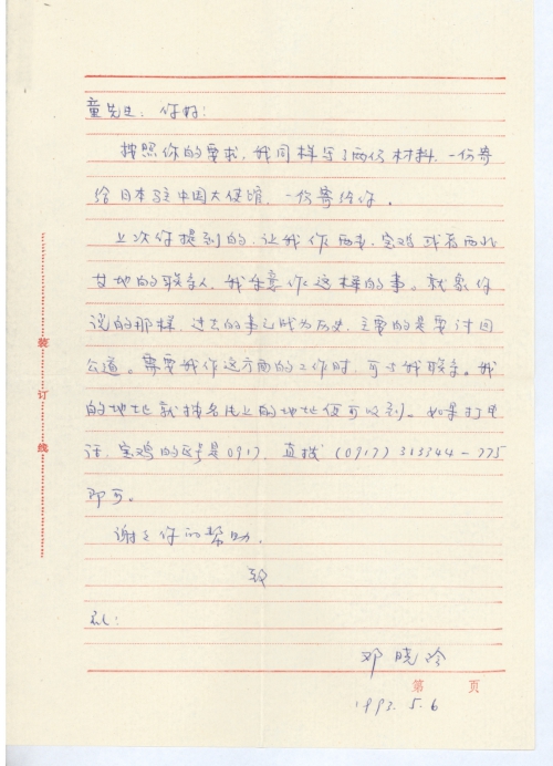 按照你的要求,我同样写了两份材料,一份寄给日本驻中国大使馆,一份寄给你。