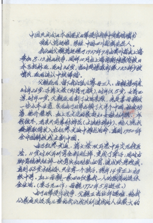 细节:我父亲1937年10月在上海被日军飞机炸死,父亲死后留下我们孤儿寡母过着凄惨的生活,日本侵华害的我家破人亡,我们坚决要求日本政府赔偿。
