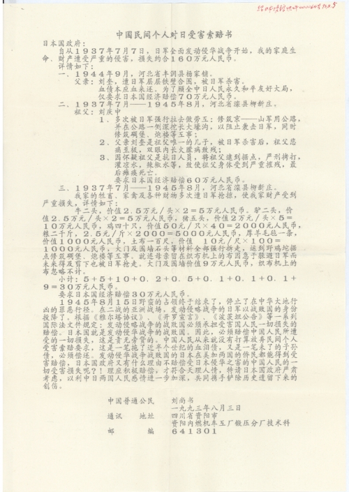 细节:1944年9月我的父亲遭到日军杀害。1937年7月到1945年8月我的祖父被日军多次强行拉去做劳工,日寇还怀疑祖父是抗日人员对他还进行了严刑拷打最后瘫痪死亡,在这期间我家的牲畜和财产也被日军掠夺。现把损失全部列出来要求日本政府赔偿。备注:信封丢失
