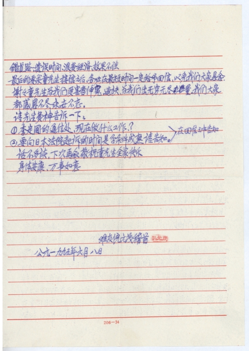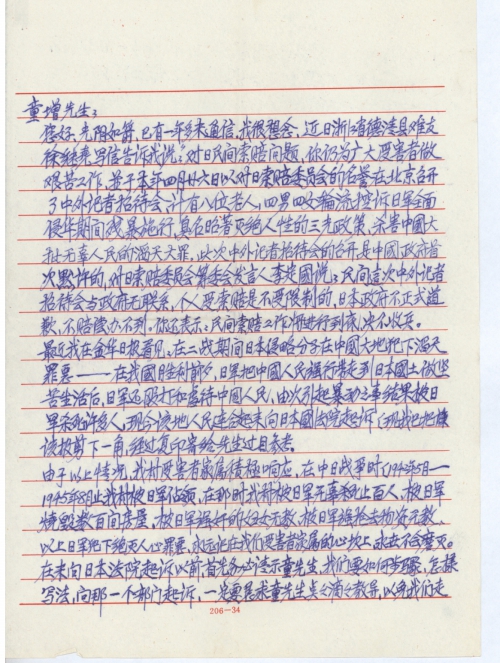 由于以上情况,我村受害者家属积极响应,在中日战争时,1942年5月——1945年8月止,我村被日军占领,在那时我村被日军无辜杀死几百人,被日军烧毁数百间房屋,被日军强奸的妇女无数,被日军强抢去物资无数,以上日军犯下绝灭人心罪恶,永远记在我们受害者家属的心坎上,永世不会磨灭。在未向日本法院起诉以前,首先务必请示童先生,我们要如何步骤,怎样写法,向[哪]一个部门起诉,一定要恳求童先生点点滴滴教导,以免我们走错道路,遗误时间,浪费经济,效果不佳。