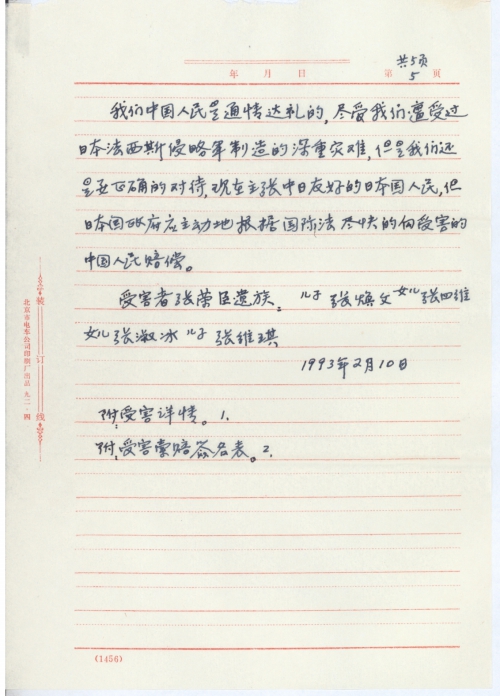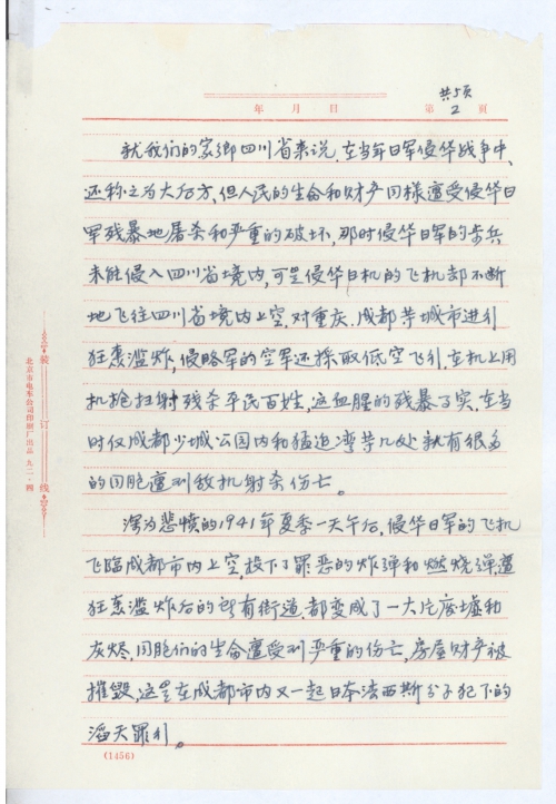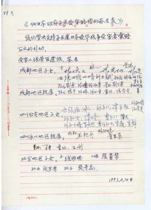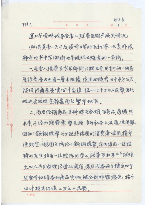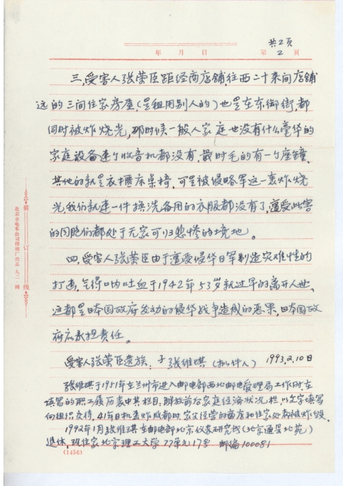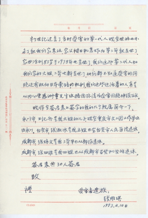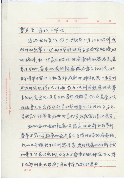 您给我的复信①于1992年11月30日收到,我即时的起草了一份:向日本国政府要求受害赔偿的初稿件和一份要求日本国政府索赔的签名表,并寄望在四川省各地我的亲属征求意见和补充,由于当年侵华日军的飞机轰炸成都时,那年我刚十来岁,对具体时间记得不太准确,最近收到我亲属他们寄来的补充意见说是日机轰炸成都是1941年夏季,上次我给童先生去信说的是40年,现更正说明此事,另外是我家父张荣臣病[逝]时是53岁,原我写的是50来岁。