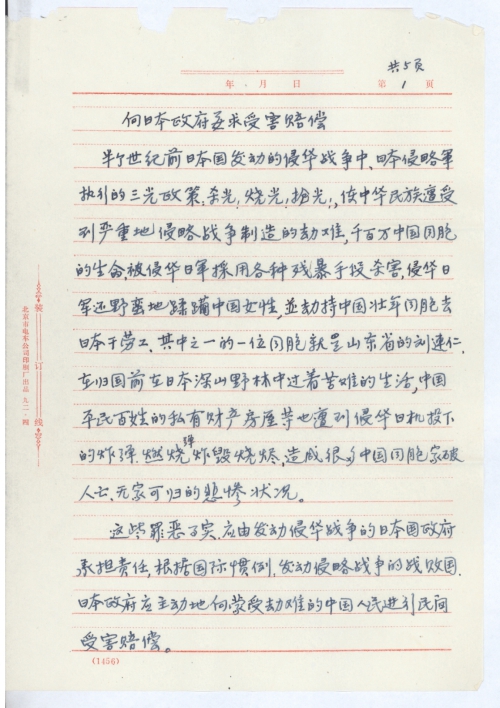 我们中国人民是通情达[理]的,尽管我们遭受过日本法西斯侵略军制造的深重灾难,但是我们还是要正确的对待,现在主张中日友好的日本国人民,但日本国政府应主动地根据国际法尽快的向受害的中国人民赔偿。