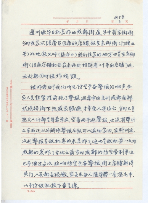 被炸前,由于我们听见防空[预]备警报的响声,全家人员赶紧提前跑了警报,逃离市内去到成都南郊武侯祠乡下亲戚家躲避,才幸免人身伤亡,当时已是热天人们都是身着单衣,空着两手逃警报,也没有带什么东西,还认为解除警报后就可以返回家内,没料到这次逃警报是敌机真的来轰炸了。(这也是敌机第一次对成都的轰炸)在此之前当时成都的防空受制单位已[预]演过多次,拉响防空[预]备警报,街上店铺都得关门,人员都要疏散,并要求每人随身带一条湿毛巾,以[预]防敌机投下毒气弹。
