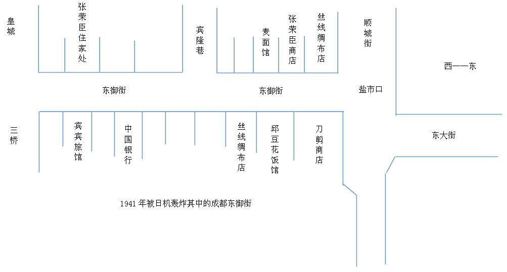 遭到侵华日机轰炸的成都街道,其中有东御街,当时我家父张荣臣经商的店铺就在东御街(门牌五号)此地段又叫(盐市口)我们住家的地方也是在东御街(经商店铺和住家点两处相距有二十来间店铺)这两处都同时被炸烧毁。