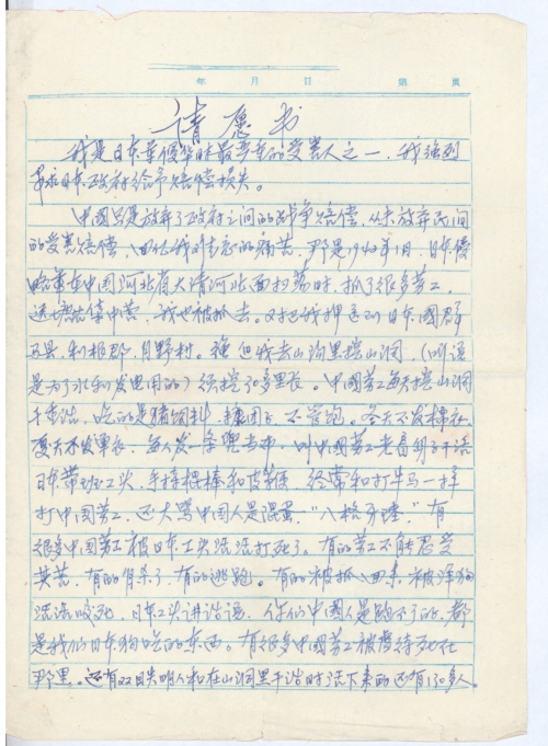 China only abandoned war compensation between governments, but it has never given up civilian damage compensation. Looking back at my unforgettable pains, it was in January 1942, when the Japanese Invasion Army was conducting a mopping-up campaign in the north of Daqing River in Hebei Province, they captured a lot of slave labors, whom were sent to Tanggu Concentration Camp. I was also captured. Later I was sent to Tsukino Village, Tone County, Gunma Prefecture in Japan, and forced to dig cave in the mountain gully (according to rumor it was for building hydraulic power station). The cave was supposed to be 30 li(1 li equals approximately 0.5 kilometers) long. Chinese slave labors were forced to engage in hard labor to dig cave each day, but they were fed with swine feed, bran ball, and were constantly hungry. In winter we had no cotton-padded coats, and in summer no unlined garments. Instead each one was issued a loincloth, and Chinese slave labors were asked to work in naked body. The Japanese foreman wielded sticks and whips to beat Chinese slave labors like beating cattle and horse, and cursed Chinese as “Bakayarou”, bastards. Many Chinese slave labors were beaten to death by the Japanese foreman, some slave labors found the hardship intolerable, some committed suicide, and others tried to escape, among them some were captured, and were gnawed to death by hounds. The Japanese foreman said, “You Chinese had no way to escape! You would become food for our Japanese hounds.” A lot of Chinese slave labors were maltreated to death there. Some lost eyesight in both eyes, others were killed when working in the cave, and only over 130 persons survived. In March 1946, with the help from the US Army, we returned to Qingdao City; among the more than 400 people in our batch of people being captured, only over 130 persons returned. With arrangements made by the Red Cross Society, we returned to hometowns. I strongly demand the Japanese government to offer compensation.