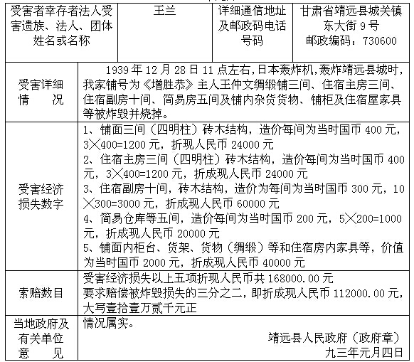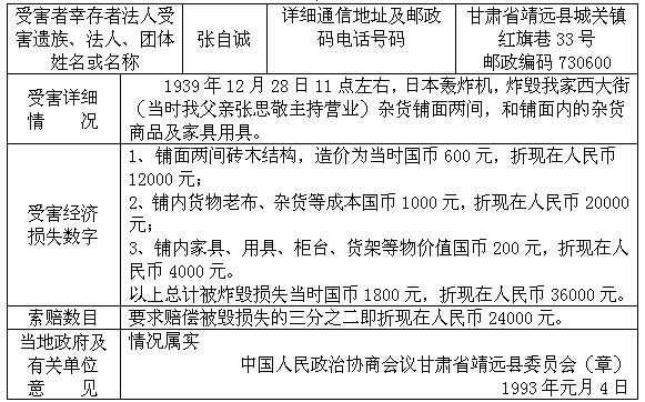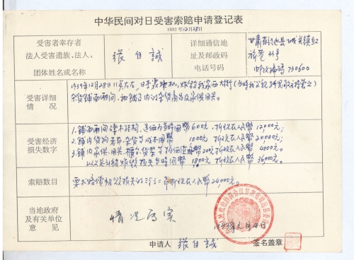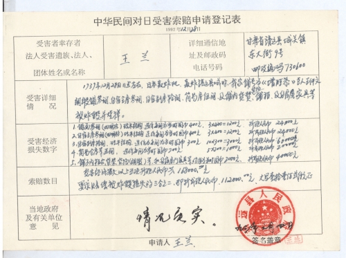 细节:寄来两份“中华民间对日受害索赔申请登记表”详细记录了受害人的信息和受害经过。并支持索赔