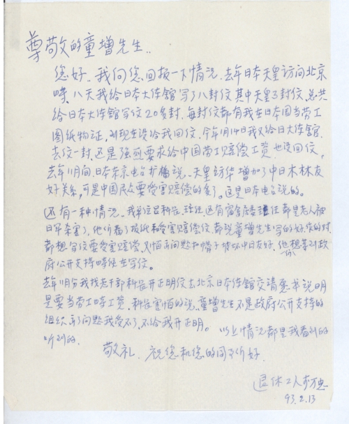 我向您回报一下情况,去年日本天皇访问北京时,八天我给日本大使馆写了八封信,其中天皇3封信,总共给日本大使馆写信20多封,每封信都有我在日本国当劳工图纸物证,到现在没给我回信,今年1月14日我又给日本大使馆去信一封,还是强烈要求给中国劳工赔偿工资也没回信,去年11月间,日本东京电台广播说,天皇访华增加了中日木材友好关系,可是中国民众要受害赔偿的多了。这是日本电台说的。还有一种情况,我单位吕科长、王主任,还有宿舍居委主任都是老人被日军杀害了,他们看了报纸和受害赔偿信都说童增先生写的好,做得对,都想写信要受害赔偿,又怕出问题扣帽子破坏中日友好,他们想等到政府公开支持日本后在写信。