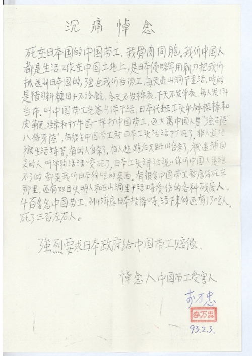 死在日本国的中国劳工,我骨肉同胞。我们中国人都是生活工作在中国土地上,是日本侵略军用刺刀把我们抓送到日本国的,强迫我们当劳工,每天进山洞干重活,吃的是猪饲料糠团子不给饱,冬天不发棉衣,夏天不发单衣,每人发1兜裆布,叫中国劳工光着身体干活,日本代班工头手拿棍棒和皮鞭,经常和打牛马一样打中国劳工,还大骂中国人是“强古陆”“八格牙陆”,有很多中国劳工被虐待死在那里,还有双目失明人和在山洞里干活时受伤的各种残废人,4百多名中国劳工,到45年底日本投降时活下来的还有130多人。死了三百左右人。