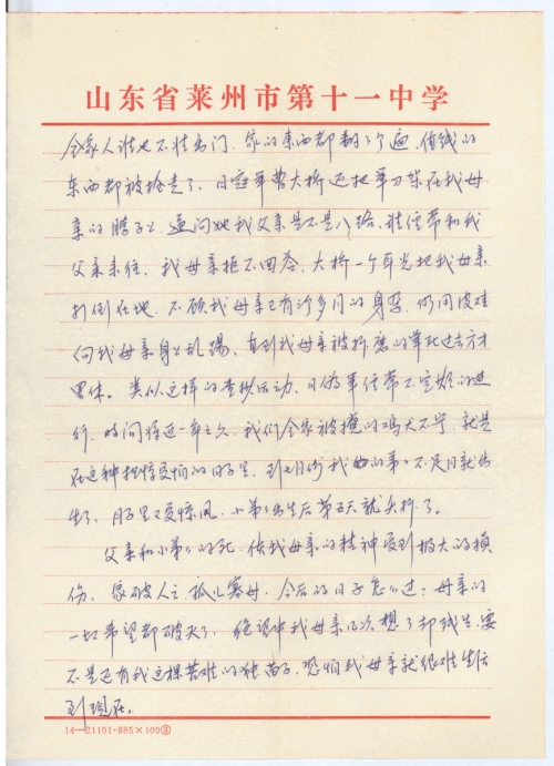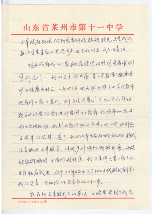 I am a family member of a victim of Japan’s invasion of China. I was born in Minzhu Village, Shahe Town, Laizhou City (originally Caijia Village, Shahe Town, Yenan County, Shandong Province), and now work in the Laizhou No.5 Middle School as a teacher.