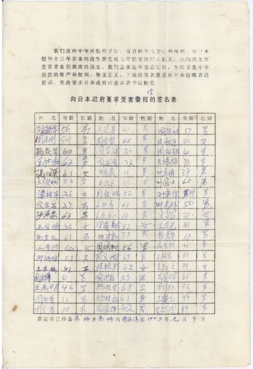 我们这些中华民族的子孙,有着神圣的责任和权力,对日本侵华十三年多来的战争所造成无可估量的巨大损失,民间的无辜受害者血泪斑斑的历史,我们是永远不会忘记的,为捍卫我中华民族的尊严和权力,伸张正义,下面的签名就是对日本侵略者的控诉,坚决要求日本政府对受害者予以赔偿。