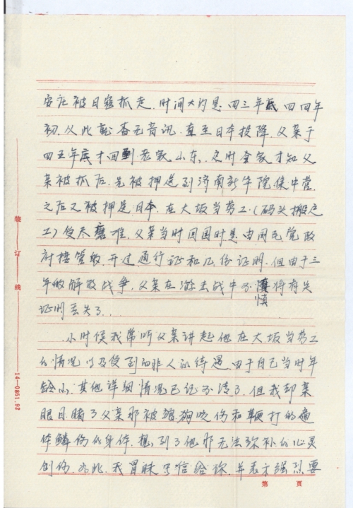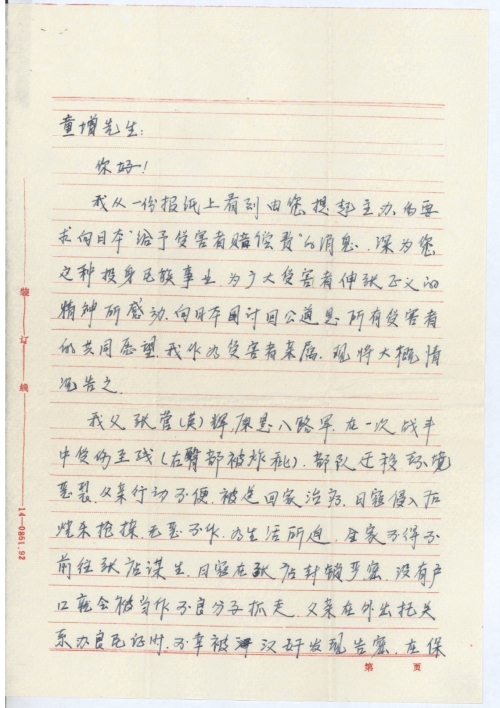 小时候我常听父亲讲起他在大阪当劳工的情况以及受到的非人的待遇,由于自己当时年龄小,其它详细情况已经记不清了,但我却亲眼目睹了父亲那被狼狗咬伤和鞭打的遍体鳞伤的身体,看到了他那无法弥补的心灵创伤,为此,我冒昧写信给你,并表示强烈要求,向日本讨回公道,借以安慰老人那未了的心愿,并向您表示深深的谢意。