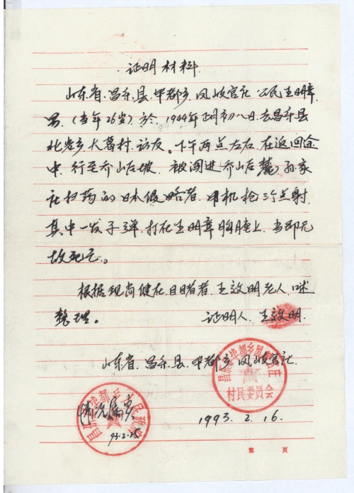 细节:1944年正月初八,我的伯父和同乡去访友,返回途中遇上扫荡的日本军结果遭到枪杀当场死亡,附上证明材料一份。希望能与童先生联系上。
