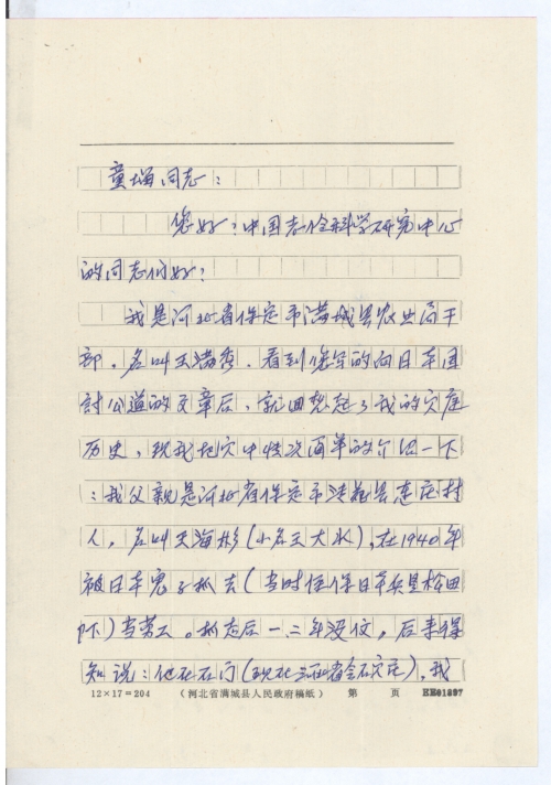 我是河北省保定市满城县农业局干部,名叫王满秀。看到您写的向日本国讨公道的文章后,就回想起了我的灾难历史,现我把家中情况简单的介绍一下:我父亲是河北省保定市清苑县连庄村人,名叫王海彬(小名王大水),在1940年被日本鬼子抓去(当时侄保日本兵是松田部下)当劳工。抓走后一、二年没信,后来得知说:他在石门(现在河北省石家庄),我母亲和叔叔就去了石门找我父亲,到石门我父已被日本鬼子烧死了。当时一起烧死的不只是我父亲一个人,共烧死了40多名。我父亲死时32岁,烧死的时间可能是42年。