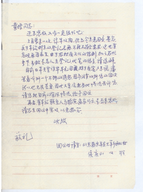 上月曾来一信,谅早已收阅,但至今未见回音,甚念。关于本站邮来的登记名册,可能不符合要求,这也有客观原因存在,由于农村受文化的限制,加之农忙季节,多数是老人去登记,代笔的很多,请谅解。