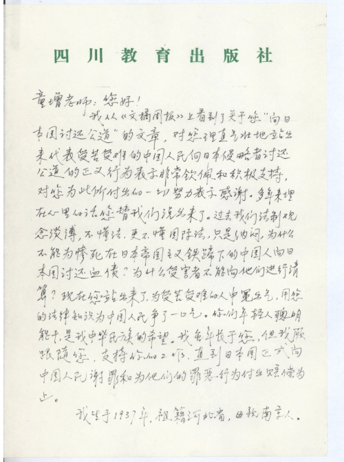 我从《文摘周报》上看到了关于您“向日本国讨还公道”的文章,对您理直气壮地站出来代表受苦受难的中国人民向日本侵略者讨还公道的正义行为表示非常钦佩和积极支持,对你为此所付出的一切努力表示感谢,多年来埋在心里的话您替我们说出来了。过去我们法制观念淡薄,不懂法,更不懂国际法,只是纳闷,为什么不能为惨死在日本帝国主义铁蹄下的中国人向日本国讨还血债?为什么受害者不能向他们进行清算?现在您站出来了,为受苦受难的人伸冤出气,用您的法律知识为中国人民争了一口气。你们年轻人聪明能干,是我中华民族的希望,我虽年长于您,但我愿跟随您,支持你的工作,直到日本国正式向中国人民谢罪和为他们的罪恶行为付出赔偿为止。