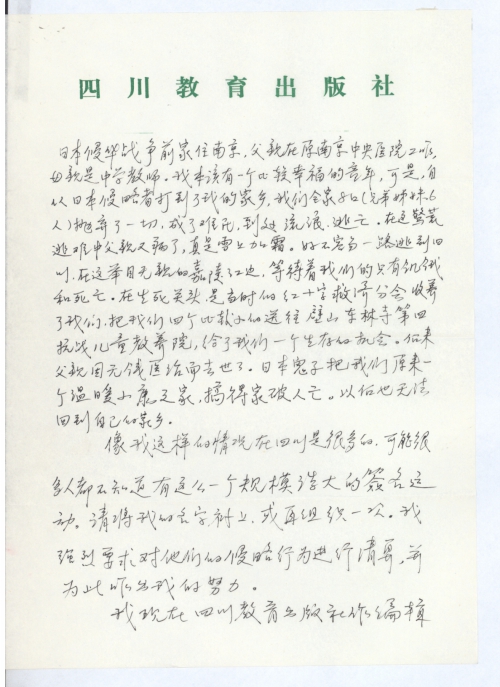 我生于1937年,祖籍河北省,母亲南京人。日本侵华战争前家住南京,父亲在原南京中央医院工作,母亲是中学教师,我本该有一个比较幸福的童年,可是,自从日本侵略者打到了我的家乡,我们全家8口(兄弟姐妹6人)抛弃了一切,成了难民,到处流浪、逃亡。在这惊慌逃难中父亲又病了,真是雪上加霜,好不容易一路逃到四川,在这举目无亲的嘉陵江边,等待着我们的只有饥饿和死亡。在生死关头,是当时的红十字救济分会收养了我们,把我们四个比较小的送往璧山东林寺第四抗战儿童教养院,给了我们一个生存的机会。后来父亲因无钱医治而去世了,日本鬼子把我们原来一个温暖小康之家,搞得家破人亡。以后也无法回到自己的家乡。