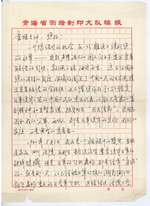 一个很偶然的机会,在一份杂志上读到您的壮举——发起声势浩大的国人向日本要求受害赔偿的行动。敬佩之情,油然而生。这不仅因为您从法律的角度,准备的阐述了中国人民向日本国提出受害赔偿的合理性,也不仅您作为千千万万饱受日军侵华之苦的中国人民的杰出代表,以自己大无畏的首创精神和足智多谋,挺身而出“为民请命”。更因为,我和我的父辈,两代人,都是日军侵华的见证,我们的家庭,正是典型的受害者。