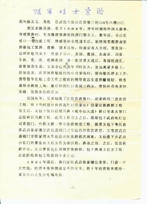 我叫陈忠义、男性,住武汉市汉口江岸徐三村115号六楼11门