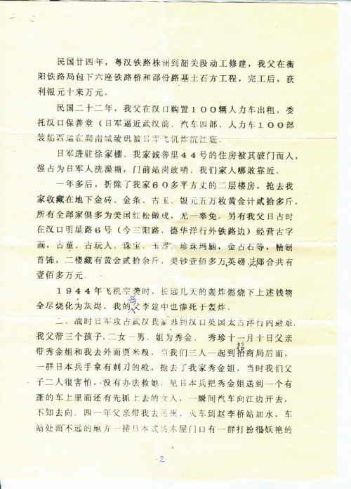 二、战时日军攻占武汉我家逃到汉口英国太古洋行内避难,我父带三个孩子,二女一男,姐为秀金、秀珍十一月十日父亲带秀金姐和我去外面贾米粮,当我们三人一起到招商局后面,一群日本兵手拿有刺刀的枪,抢去了我家秀金姐,当时我们父子二人很害怕,没有办法救她,见日本兵把秀金姐送到一个有蓬的车上里面还有先抓上去的女人,一瞬间汽车向江边开去,不知去向,四一年父亲带我去岳州,火车到赵李桥站加水,车站外(“处”编辑为“外”)面不远的地方一排日本式的木屋门口有一群打扮很妖艳的姑娘在嬉笑,我忽然在其中看见了秀金姐,我和父亲都大声喊叫他的名字,不想被日本看守兵听见把他们全都用枪托打回木屋内去了,当时我听到秀金姐哭声,这时火车已离了赵李桥车站,这些人间难以忍受的痛苦,我父亲得了严重的胃痛病长期吃日本药房的胃和药粉。后来我和父亲又多次去两湖交界的通山县、崇阳县、平江、岳州等地打听据有的被拉去当苦力的人说我的秀金姐得了重病被日军折磨死了。