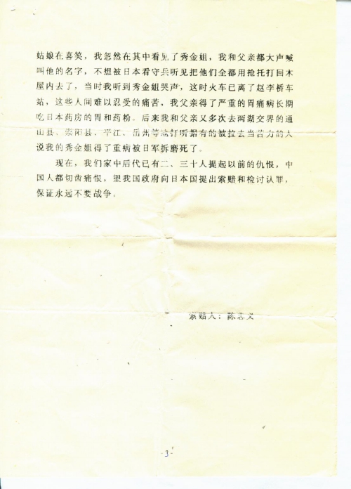 Today, in my family 20 or 30 people havementioned of the past suffering and hate. It makes all the Chinese people gnash their teeth in anger. We hope that the Chinese government will demand an apology and compensation from Japan and make Japan ensure that it will never launch a war again.