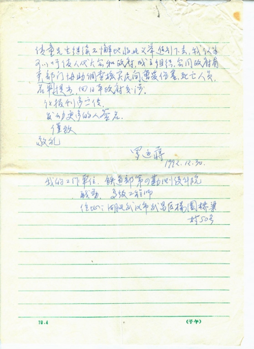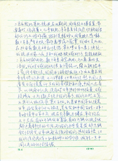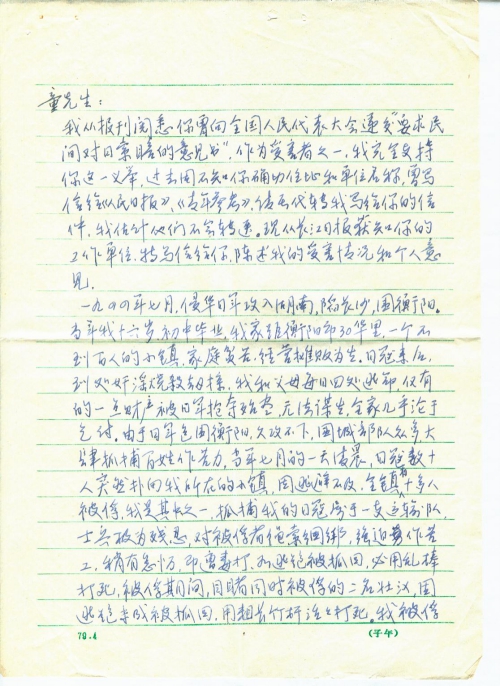 我从报刊阅悉你曾向全国人民代表大会递交“要求民间对日索赔的意见书”,作为受害者之一,我完全支持你这一义举,过去因不知你确切住址和单位名称,曾写信给《人民日报》、《青年参考》,请为代转我写给你的信件,我估计他们不会转送。现从长江日报获知你的工作单位,特写信给你,陈述我的受害情况和个人意见。