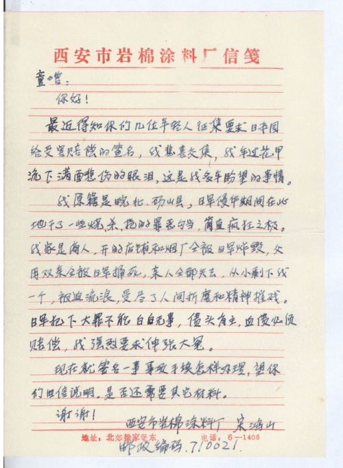 最近得知你们几位年轻人征集要求日本国给受害赔偿的签名,我悲喜交集,我年过花甲留下满面悲伤的眼泪,这是我多年盼望的事情。