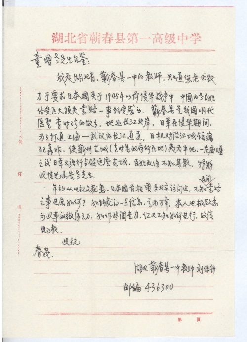 我是湖北省、靳春县一中的教师,知道您老正致力于要求日本国关于1945年以前侵华战争中,中国的老百姓倍受巨大损失索赔一事很受感动。靳春县是我国明代医圣李时珍的故乡,地处长江北岸,日军在侵华期间,为了打通上海——武汉的长江通道,日机对沿江城镇疯狂轰炸,使靳州古城(当时县政府所在地)夷为平地,一片废墟之后日军又强行占领这座古城,百姓死伤不知其数,特将此情况函告老先生。
