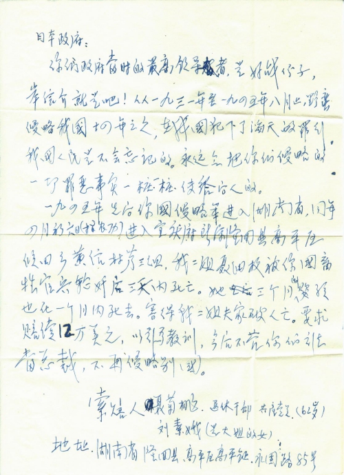 一九四五年先后你国侵略军进入湖南省,同年四月初六日(指农历)进入宝庆府所属隆回县,我二姐聂细枚被你国畜生官兵轮奸后三天内死亡。她三个月的婴孩也在一个月内死去,害得我二姐夫家破人亡。要求赔偿12万美元,以引为教训,今后不管你们谁当总裁,不再侵略别国。