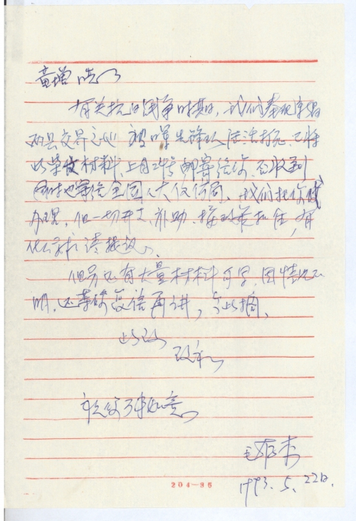 有关抗日战争时期,我们奉化新昌两县交界之地被日军先锋队活活打死,已将此信材料,上月24号邮寄给你,是否收到?同时也寄给全国人大信访局,我们托你代办理,但一切开支、补助,按政策扣住,有什么要求请提议。
