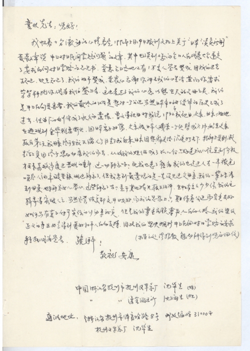我怀着十分激动的心情看完1992年5月19日报刊文摘上关于“日本《读卖新闻》发表文章谈中国对日民间索赔问题”的文章。其中也谈到您向全国人民代表大会递交了要求民间对日索赔的意见书,并悉全国各地已有1万多人签名赞成。因我们过去不知道,现在知道了,我们双手赞成,并衷心感谢你讲出我们心里话,并向你要求劳驾拜托你代为我们签上名,这也表达了我们心愿,以慰在天的父母之灵。我们是中国民间受害者,我们最终的目的是想讨一个公道,当然日本帝国主义侵华的历史已成了过去,但留下的创伤成了永久的遗恨。曾记得祖母对我说,1942年我祖母、父亲、母亲、姐姐,在逃难到金华雅番断头,因日本鬼子扫荡,父亲被日本人残杀一个头劈成六片。就在父亲死后第三天,我母亲终于在我不满七个月生下我。后来母亲因悲痛交结沉重打击下,精神上受刺激,生活上贫困,终于悲切切离我们而去。从此我们姐俩成了孤儿后只好送孤儿院直到解放才出来,靠救济度过苦难的童年。这一切能忘吗?现我也患了癌症,我们也走过人生一半旅途,尝尽人间辛酸苦辣,难道能忘了。但我感到最遗憾的是一生没见过父母亲,我们一辈子未得到母爱,也未能尽女儿孝心。这些能忘了吗?至于其他损失根本不用讲。在中国有多多少少像我们这样弄得家破人亡。当然尽管恢复邦交,中日友好,而我们思想上只期待着公道,而究竟友好如何,只有真正付于实际的行动来证实。但是我们尊重民族尊严、人民的人格,我们坚信正义的事业必定得到爱好和平人民的支持。因此我们坚决拥护中国民间对日索赔的要求,拜托代为签名。跪拜!(不当之处请指教,恳切能得到您的回信)