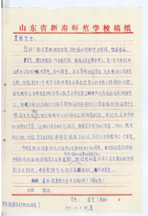 首先,请允许我作一下自我介绍:我是山东省泰安市人,是一名今年刚毕业参加工作的大学生,名叫潘登。这次冒昧给您写信,是受我外公王传圣之托,向您打听一下关于日本向曾在日本做过劳工的中国人赔款的问题。因为我外公当年也是被日本人抓去日本做劳工后,又死里逃生的中国劳工。他已将自己当年的经历及材料证明等寄给了江苏盐城的熊涵东先生,熊涵东先生来信说他已将我外公的情况及材料寄给了您,并说您是非常热心此事的专家,让我们写信与您联系,看看是否有了什么结果。所以,我受外公之托,向您写了这封信,希望您在工作之余,百忙之中给我外公一个答复。