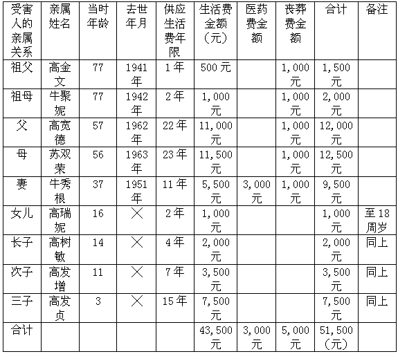 受害人高庆保亲属情况与索赔金额一览表