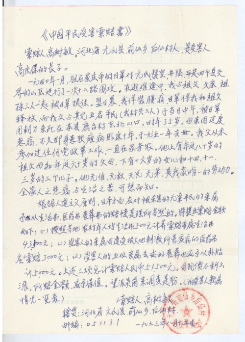 细节:日军对元氏县进行了围攻,在逃难中我和祖父、父亲被日寇抓住我假装肚子疼日军便放了我和祖父,然而我的父亲和其它5位村民被日寇活活用刺刀杀死,母亲因过度悲伤病患缠身一直瘫痪在床。日本无辜杀害中国百姓使许多个家庭家破人亡,因此日本国应赔偿每个受害者和家庭。另附上索赔金额一览表。
