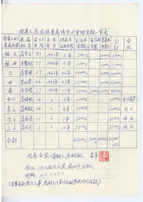 根据人道主义原则,日本方面应对被杀害的无辜平民的亲属予以生活费、医药费、丧葬费的赔偿是理所当然的。特提出索赔金额如下:(一)按照当地农村年人均生活费500元计算,索赔亲属生活费43500元;(二)受害人的亲属因遭受极大地刺激所患疾病的医药费应索赔3000元;(三)受害人的五位亲属去世的丧葬也应予以补贴计5000元。上述三项总计索赔人民币51500元。因物价不断上涨,所赔金额应予保值。望派员前来调查是盼。(附受害人亲属情况一览表)