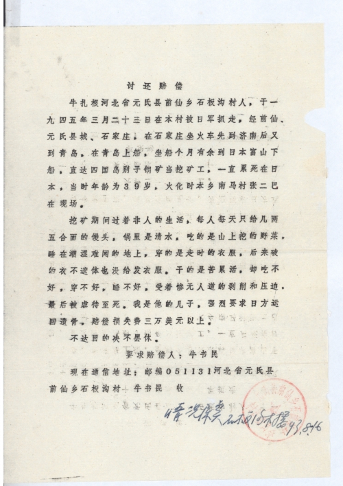 牛轧根河北省元氏县前仙乡石板沟村人,于一九四五年三月二十三日在本村被日军抓走,经前仙、元氏县城、石家庄,在石家庄坐火车先到济南后又到青岛,在青岛上船,坐船个月有余到日本富山下船,直达四国岛别子铜矿当挖矿工,一直累死在日本,当时年龄为39岁,火化时本乡南马村张二巴在现场。