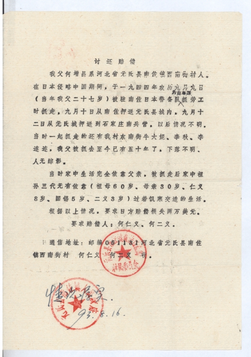 细节:我的父亲在1944年农历9月9日被日军抓走后至今情况不明,当时家中生活完全依靠父母,父亲被抓走后我一家过着饥寒交迫的生活。我要求日本赔偿我家所有的损失。