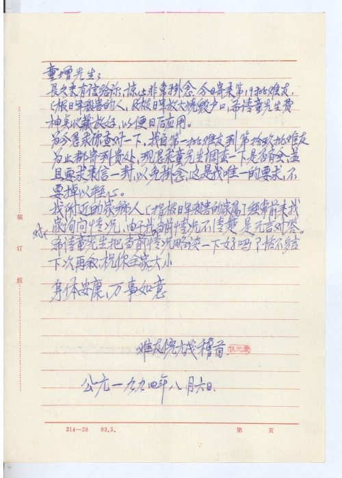 Fellow townsfolk living near me (referring to family members being killed by the Japanese Army) often came to my home to inquire about the progress of the compensation matter. Since I am not clear about the current situation, I don’t know how to answer their questions. Could Mr. Tong please briefly inform me of the current situation? I will say no more, let’s talk next time, wish all your family members healthy and all the best.