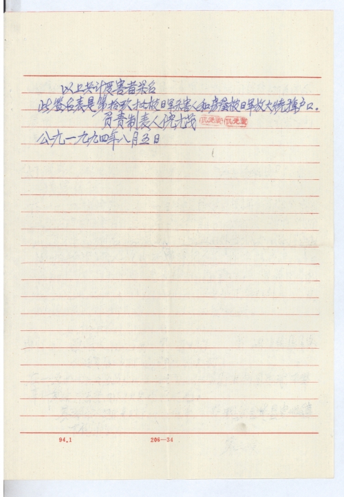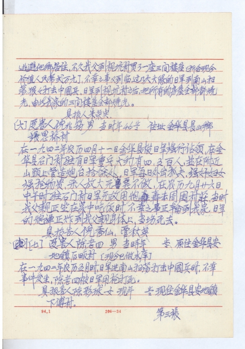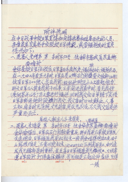 Other details:A copy of materials was sent here, which was about the fact that the Japanese invaders forcibly occupied Jinhua County in 1942 and made the people suffering. Among the victims, some were killed by the Japanese aircrafts; some were bayoneted to death; some were caught and press-ganged, and so on.