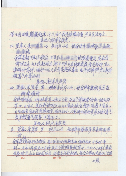 After Jinhua County was occupied by the Japanese Army, the Japanese Army every day came out to capture slave labors, rape women, loot materials, in September 1942 on the lunar calendar, a Brigade troop (Red Troop) of the Japanese Army with over 300 people was stationed at Shimen Village, Changshan Town, they built gun turrets on the nearby hills of our village, on that day several Japanese soldiers came to our village to commit crimes, and unfortunately intruded into our home, they saw my elder sister) (Zhu XX aged 16) and immediately want to rape her, at that time my father knelt to the Japanese Army to plead for mercy, the Japanese Army immediately beat my father with gun stock, my father immediately vomited blood and fainted, because at that time there was no hospital, no drug store, there was no way to bring treatment, soon my father passed away due to serious injury.