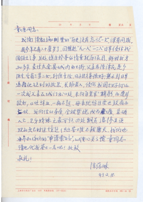 我今年已有八十虚岁了,回想起“九一八”“一二八”日军侵占我国领土之事,到处烧杀抢夺的情景犹历历在目,那时我才20多岁,家住太仓县城内西大街,父亲名陈泽民,是个医生,生有三男二女,行医生活,日子过得很好,想不到日军[凭借]他锐利的武器,长驱直入,侵占我国大好河山,一次我父亲在城门出口处,未向“日皇军”鞠躬,而遭到殴打,呕吐鲜血,一病不起,母亲忧伤过度也致病而亡故,我们住的房屋,全被焚烧成为废墟,家破人亡,兄弟姐妹无家可归,四处飘荡,凄惨至极,现在虽时过境迁,但这苦难不能磨灭,我们也要参加你们的“申请索赔”,以泄心头之愤,童同志,请也代我签上一名吧!