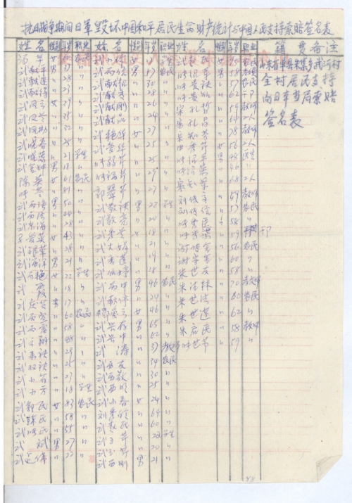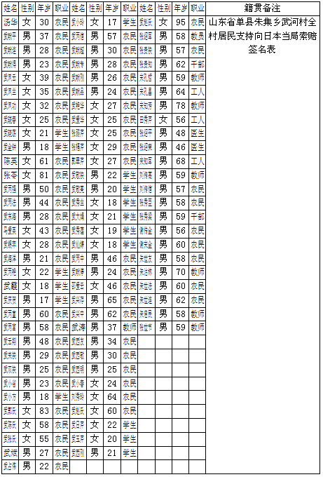 21 10 月, 2018 s2494 Share EmailTwitterFacebookGoogle +PinterestTumblrLinkedinVkontakte 信扫描序列号:s2494 写信日期:1993-04-30 写信地址:山东省菏泽市单县 受害日期:无 受害地址:无 写信人:武兴杰(寄) 受害人:无 类别:其它(OT) 细节:寄来两份单县村民支持民间向日本索赔签名表。 抗日战争期间日军毁坏中国和平居民生命财产统计与中国人民支持索赔签名表 抗日战争期间日军毁坏中国和平居民生命财产统计与中国人民支持索赔签名表 21 10 月, 2018 10000cfj_3o5som 其它(OT)