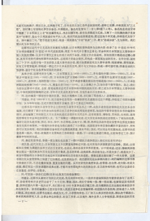 成汉昌:近代历史上,日本军国主义不仅野蛮地侵略过中国,也对其他许多国家进行过侵略。因此,以侵略和反侵略为课题的各种方式的历史研究,在战后,得到各国史学界的重视。以中国来说,过去,海峡两岸都曾出版过一些反映当年历史实况的图片集录。但总的来看,这类战果,到目前为止,不是太多了,而是太少了,和当年那场伟大斗争的历史地位和历史影响相比仍有很大的差距。香港这家出版社做了一件大好事。这部书我们仅从宣传资料上知道了它的概况,还没看到全书。我仍感到无论从体例内容上,我们编辑的这部书都与香港的不同,不存在叠床架屋、重复出版的问题。从历史研究的角度来说,在香港,在台湾,在大陆,在亚太各国,都应有这一历史课题的成果出版,才能与当年那场伟大的民族自存、自卫战争相均称,也可以让读者自己去鉴定,去评论,去取舍。
