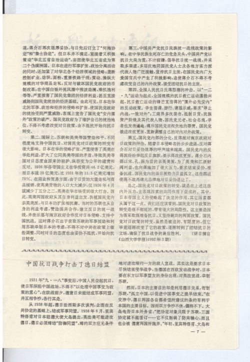 总之,国民党对日政策的转变,就是在上述这些内外压力,主客观因素的共同作用下促成的。其中,日本帝国主义的侵略起了决定的作用,其它因素都从属于这一点。我们还应该看到,国民党对日政策的转变是很不彻底的,带有很大的局限性。这主要是因为蒋采取既准备抗日,又坚持剿共的两面政策。国民党对日政策的转变,虽然是被迫的、有限度的,但它毕竟逐渐改变了它的政策,逐渐转到了团结抗日的立场,确保了抗日战争的最后胜利。(研日摘自《山西大学学报》1992年3期)