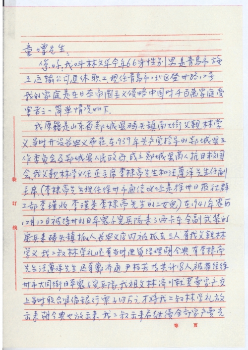 我叫林文华,今年66岁,性别男,是青岛市施三运输公司退休职工,现住青岛市北区登州路12号,我的家庭是在日本帝国主义侵略中国时千百万家庭受害者之一,简单情况如下: