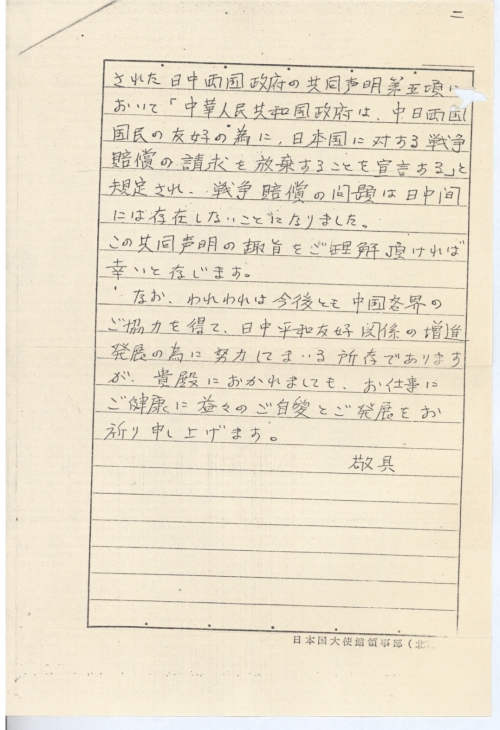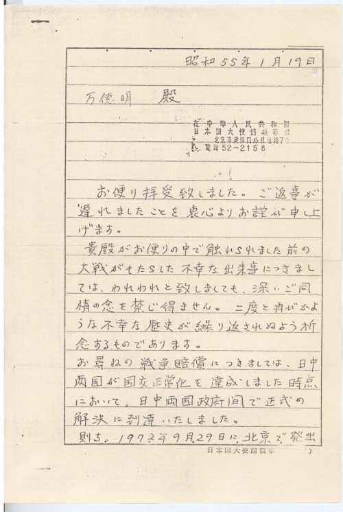 对于您在来函中所提及的前次大战造成的不幸事情,我们在深表同情的同时,衷心的希望再也不要重演那样不幸的历史。关于您所提问的战争赔偿问题,日中两国在完成邦交正常化之际,正式达成协议得到了解决。具体地说,日中两国政府一九七二年九月二十九日在北京发表了联合声明,该声明的第五项规定,中华人民共和国政府为中日两国国民的友好宣告放弃对日战争赔偿要求,因而日中间已经不存在战争赔偿问题。请您多多理解本声明之意旨为盼。